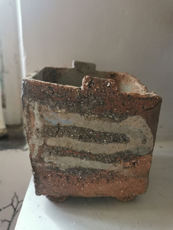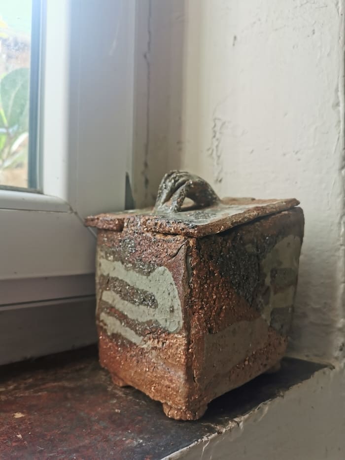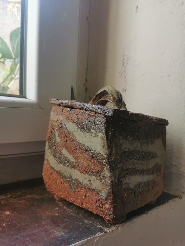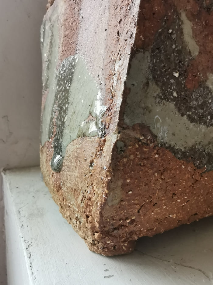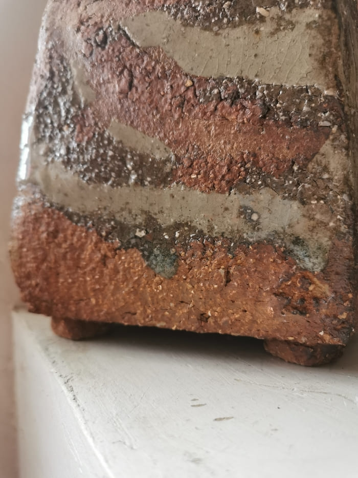 Jacques Laroussinie – Boite en grès très chamotté de forme rectangulaire penchée, partiellement émaillée, engobes et cendres